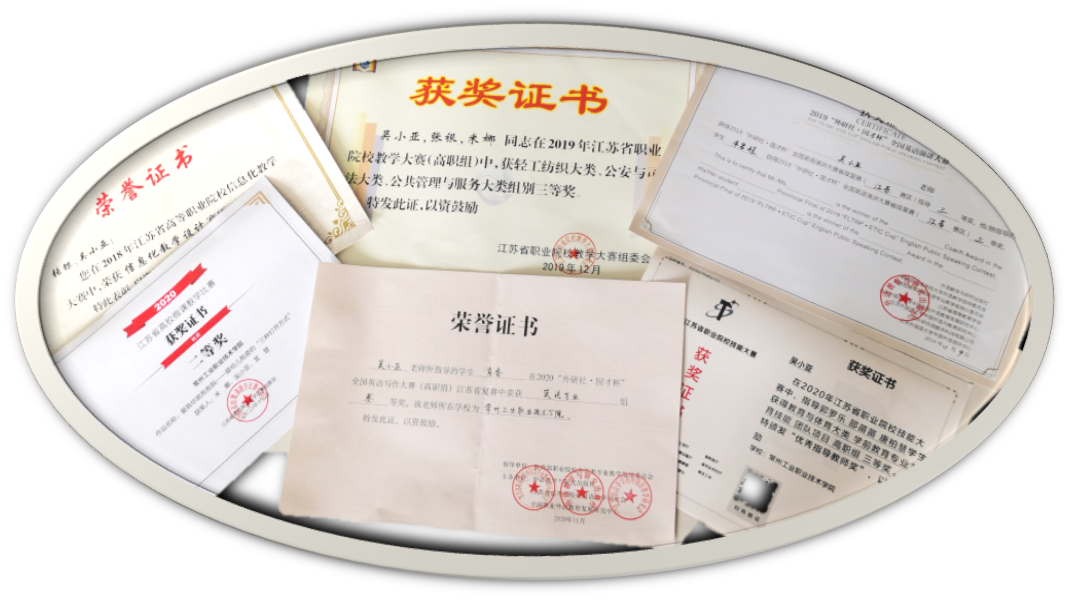 專業教師團隊結構合理,銳意進取,在各級各類競賽中屢獲佳績,近三年獲江蘇省高職院校信息化教學大賽一等獎1項,二等獎1項;江蘇省職業院校教學能力大賽高職組三等獎1項;江蘇省高校微課教學比賽二等獎1項。指導學生參加省市技能競賽,獲“外研社杯”全國英語演講大賽(江蘇賽區)獲一等獎1項,三等獎2項;“外研社杯”全國英語寫作大賽(江蘇賽區)二等獎2項,三等獎1項;江蘇省高職院校藝術插花技能大賽二等獎1項,三等獎1項;江蘇省高等職業院校技能大賽英語口語賽項三等獎1項,學前教育專業教育技能賽項三等獎2項。