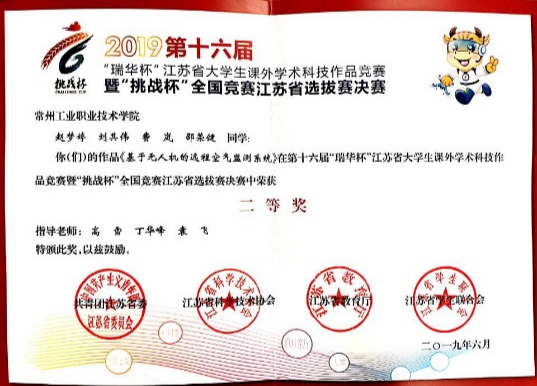 我們的學長們積極參加各類技能技術比賽,獲得江蘇省大學生電子設計競賽無人機專賽項一等獎、江蘇省“挑戰杯”大學生課外學術科技作品制作二等獎;“互聯網+”創新創業大賽江蘇省二等獎;常州市高等教育和職業教育創新創業大賽高校組二等獎;江蘇省大學生機器人大賽“室內空中巡邏救援”無人機賽項一等獎;“野外空中巡邏救援”無人機賽項三等獎;全國職業院校農業植保機技能大賽三等獎;“極光UAV”無人機社團在2019年、2020年連續兩年被評為常州市十佳社團;學生獲得無人機方向1項發明專利和多項實用新型專利的授權。