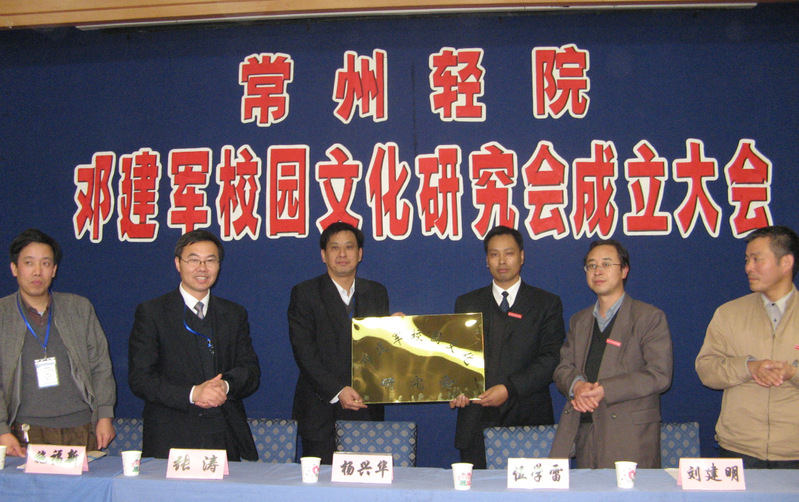 成立鄧建軍校園文化研究會(后改為“鄧建軍學校文化研究會”),左3為時任黨委書記楊興華,左2為時任黨委副書記張濤