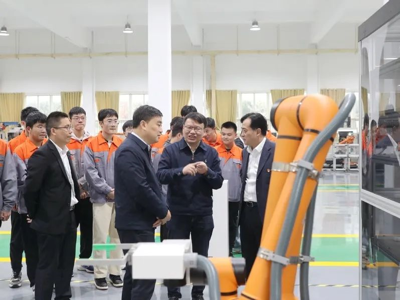 參觀鄧建軍工匠學院實訓室(前排從右至左:校長楊勁松、全國勞模鄧建軍、黨委書記席海濤)