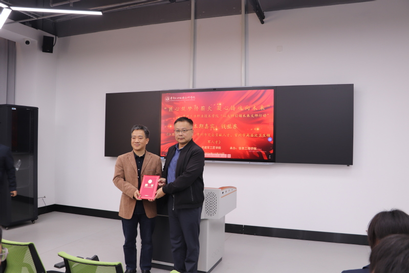 鄧建軍工匠學(xué)院院長(zhǎng)袁飛為錢衛(wèi)東頒發(fā)了“以大師引領(lǐng)未來(lái)大師行動(dòng)”師徒結(jié)對(duì)導(dǎo)師聘書。