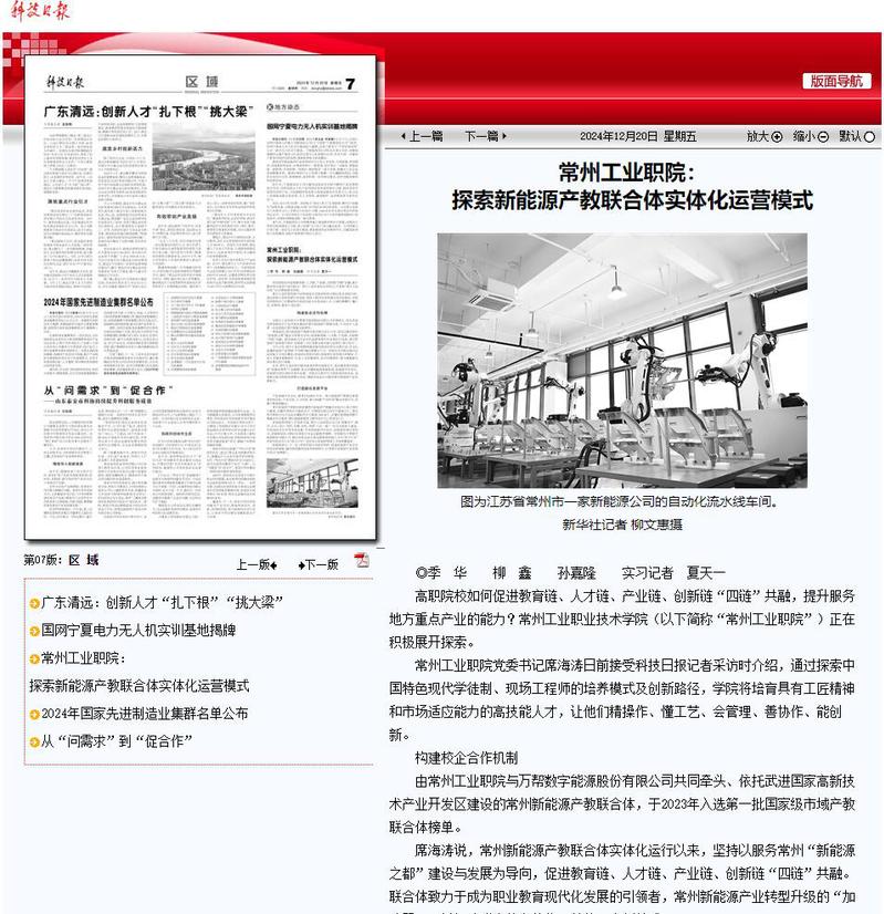 科技日報:常州工業職院:探索新能源產教聯合體實體化運營模式