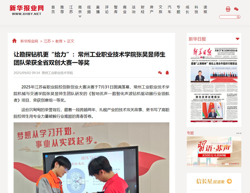 新華報業網:讓勘探鉆機更“給力”:常州工業職業技術學院張昊昱師生團隊榮獲全省雙創大賽一等獎