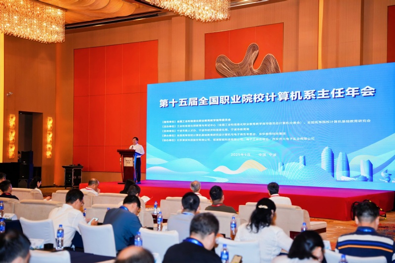 9月21日,第十五屆全國職業院校計算機系主任年會在浙江寧波召開。本屆年會由工業和信息化部教育與考試中心、全國高等院校計算機基礎教育研究會聯合主辦,以“數智融合·產教協同”為主題,匯聚全國職業教育領域的專家學者、院校代表及行業企業精英,共話人工智能時代下的職業教育改革與高質量發展。我校副校長檀祝平應邀出席,并在“工信領域產教融合”平行論壇上作《兩翼齊飛,打造產教融合新形態》專題匯報,系統展示了學校在國家級行業產教融合共同體建設中的創新實踐與顯著成效。