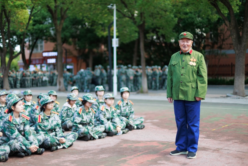 訓(xùn)練場上,旌旗獵獵、口號(hào)聲聲。陸恩和老先生身著綠色軍裝,胸前的榮譽(yù)獎(jiǎng)?wù)略陉柟庀麻W耀,成為“行走的思政課”最生動(dòng)的“實(shí)踐范本”。他以親歷者的視角將時(shí)光拉回當(dāng)年的崢嶸歲月,講述著物資匱乏、炮火連天的戰(zhàn)斗環(huán)境,革命先烈舍生忘死的動(dòng)人故事,平實(shí)的話語里滿是堅(jiān)定的信仰和忠誠。